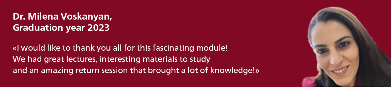 Each module begins with a half-day afternoon kick-off session consisting of three presentations by tutors and ends with a return session held the morning before the afternoon kick-off session of the next module. Both sessions are delivered in a hybrid face-to-face mode in Bern and online mode. The ̴14 weeks in between are structured in 4 steps: e-learning from online resources including figures and animations, solving a main individual online task (case-based or article-based learning including quizzes), online learning from each other's tasks and formulating challenge questions, and finally preparing individual short presentations and common group answers to challenge questions for the return session. Quizzes, final exam and presentations will be graded.