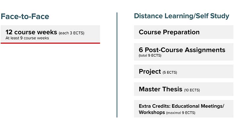 The MME program is designed to be conducted alongside participants’ employment and has a modular format. A workload of 80% for full-time employment is recommended. Approximately 25 hours should be allocated for course preparation. The performance is measured according to the European Credit Transfer System ECTS. One credit corresponds to a workload of 25-30 hours. Credits can be acquired for all study activities within the MME course.