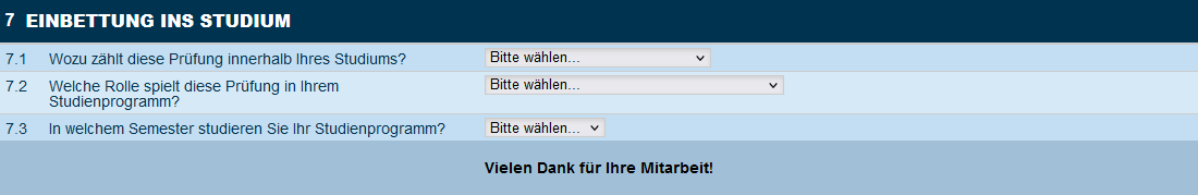 Der Standardfragebogen kann in erster Linie für die Evaluation schriftlicher und mündlicher Prüfungen verwendet werden, welche in einem direkten Zusammenhang zu einer Lehrveranstaltung stehen und eine Mindestanzahl von 5 Teilnehmenden haben.
