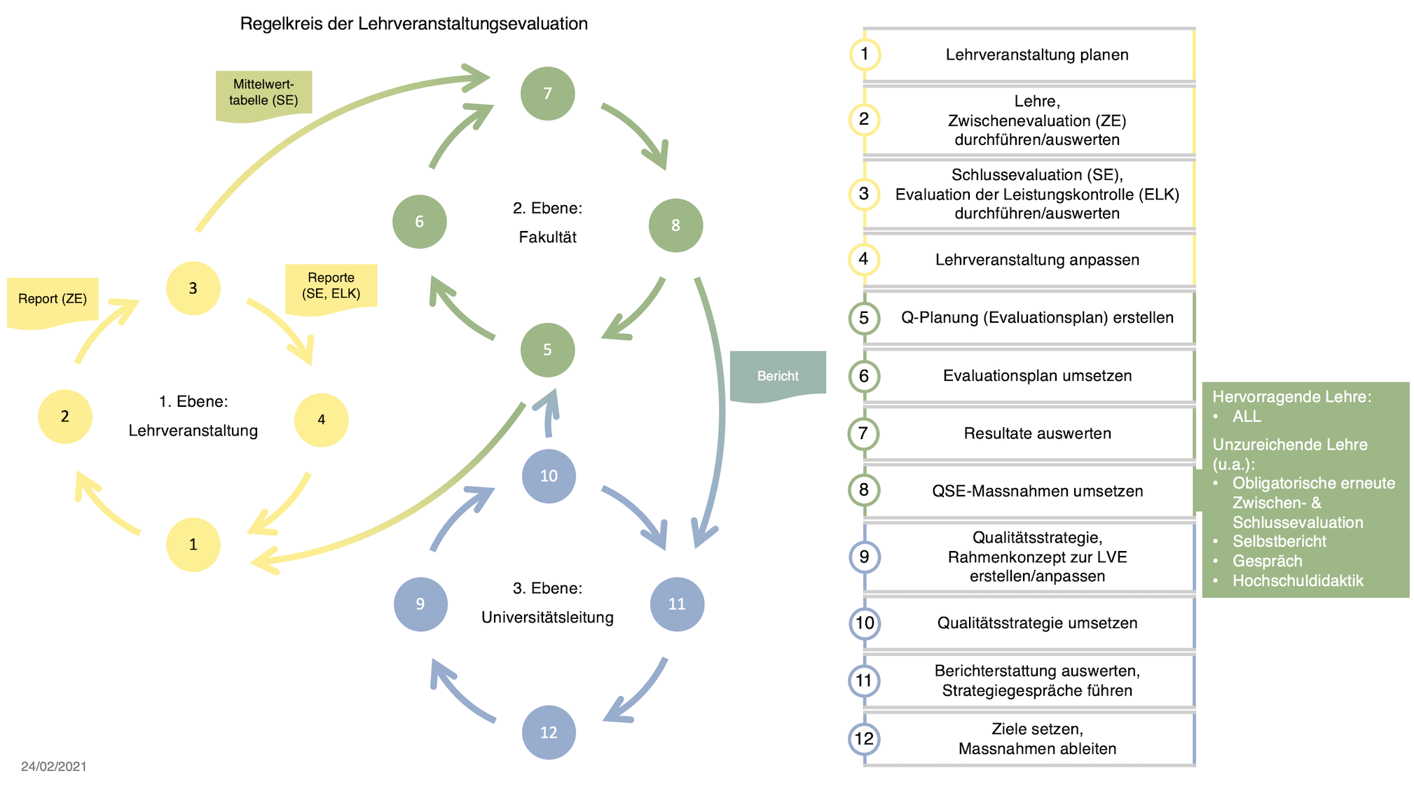 Zusätzlich legen die Fakultäten fest, welche Lehrveranstaltungen zu welchem Zeitpunkt evaluiert werden müssen (5) und sorgen dafür, dass dieser Plan entsprechend den Richtlinien umgesetzt wird (6).