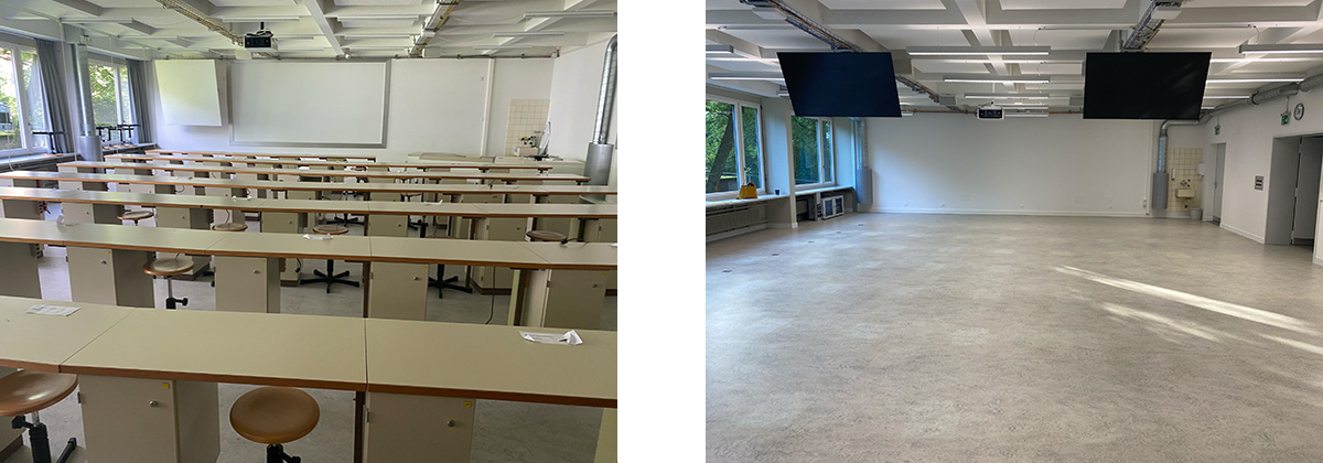 Weiter mussten verschiedene Vorgaben von Seite Brandschutz umgesetzt werden. Auch dieses Umbauprojekt verfolgte das Motto: so viel wie notwendig, so wenig wie möglich. Primäranforderung war, den Saal mit einer mobilen Möblierung von 108 Plätzen zur kombinierten Benutzung sowohl als Hör-, wie auch als Mikroskopiersaal (54 Plätze) nutzbar zu machen. Primär soll der Raum als Hörsaal genutzt werden. Die Mikroskope werden bei Bedarf aufgestellt und sind im hinteren Teil des Raums in grossen Schränken verstaut.