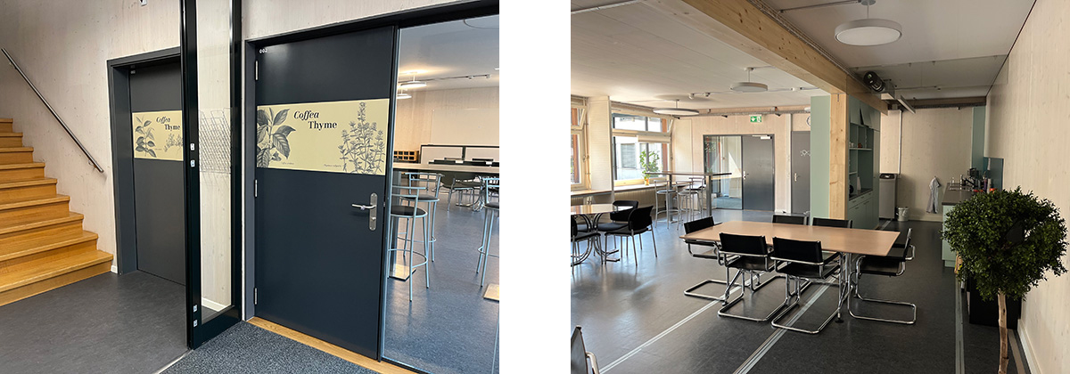 Eine weitere Massnahme, um die räumliche Situation auf dem Areal verbessern zu können, war der Entscheid der Zentralisierung der Begleitnutzungen. Durch den Rückzug der Bibliothek aus dem Erdgeschoss, konnten mit baulichen Anpassungen im Pavillon Büroräume, ein Post- und Copy/Print-Raum sowie ein Aufenthaltsraum realisiert werden. Dadurch konnten Fläche nahe der Labornutzung freigespielt und eine zentrale Anlaufstelle mit einem Raum für gruppenübergreifende und spontane Austausch und wissenschaftliche Diskurse geschaffen werden. Für die Studierenden stehen im Obergeschoss weiterhin die Bibliothek und Lernarbeitsplätze zur Verfügung.