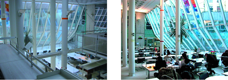 Das Architekturbüro AAP schob den unterirdischen Neubau an die hinteren Pavillons des Hauptgebäudes - eine Lösung, die den Knick der Sidlerstrasse in einem keilförmigen Hofraum verarbeitet. Die geneigten Glasfassaden, mit denen der zentrale Lesesaal an diesen Hof grenzt, bringen eine erstaunliche Lichtmenge ins Bibliotheksinnere und bieten unerwartete Aussichten. Dank eingehängter Emporen profitieren die Arbeitsbereiche bis ins zweite UG vom weichen Tageslicht der mit Glasbausteinrosten gedeckten Räume, das sich unauffällig mit dem künstlichen Licht vermischt.