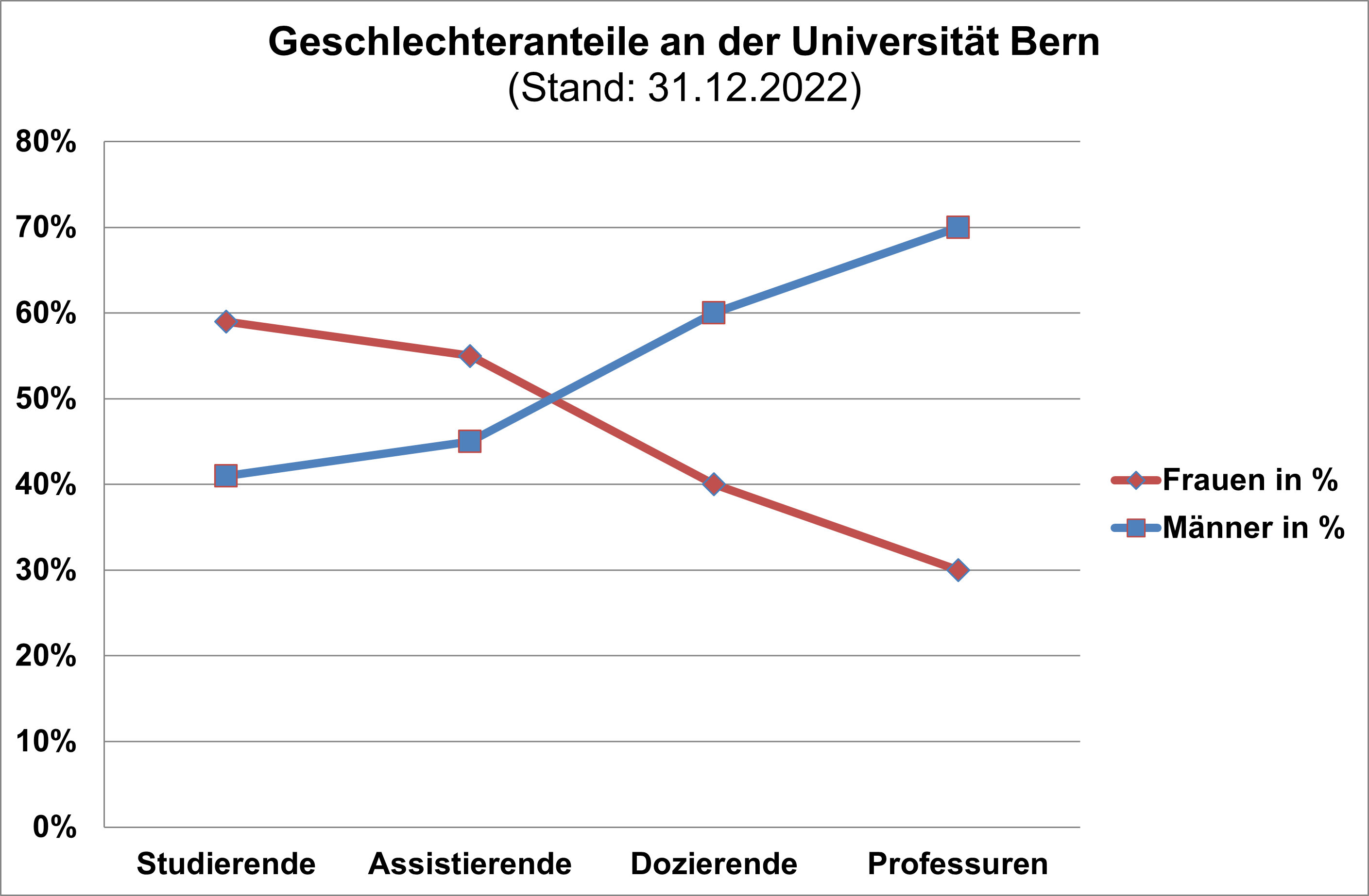 Mehr als die Hälfte aller Studierenden an der Universität Bern sind derzeit weiblich. Auf den höheren akademischen Stufen sind Frauen aber untervertreten. Je höher die Stufe in der akademischen Karriere, desto kleiner wird der Frauenanteil. Dieser Effekt wird als vertikale Segregation bezeichnet.
