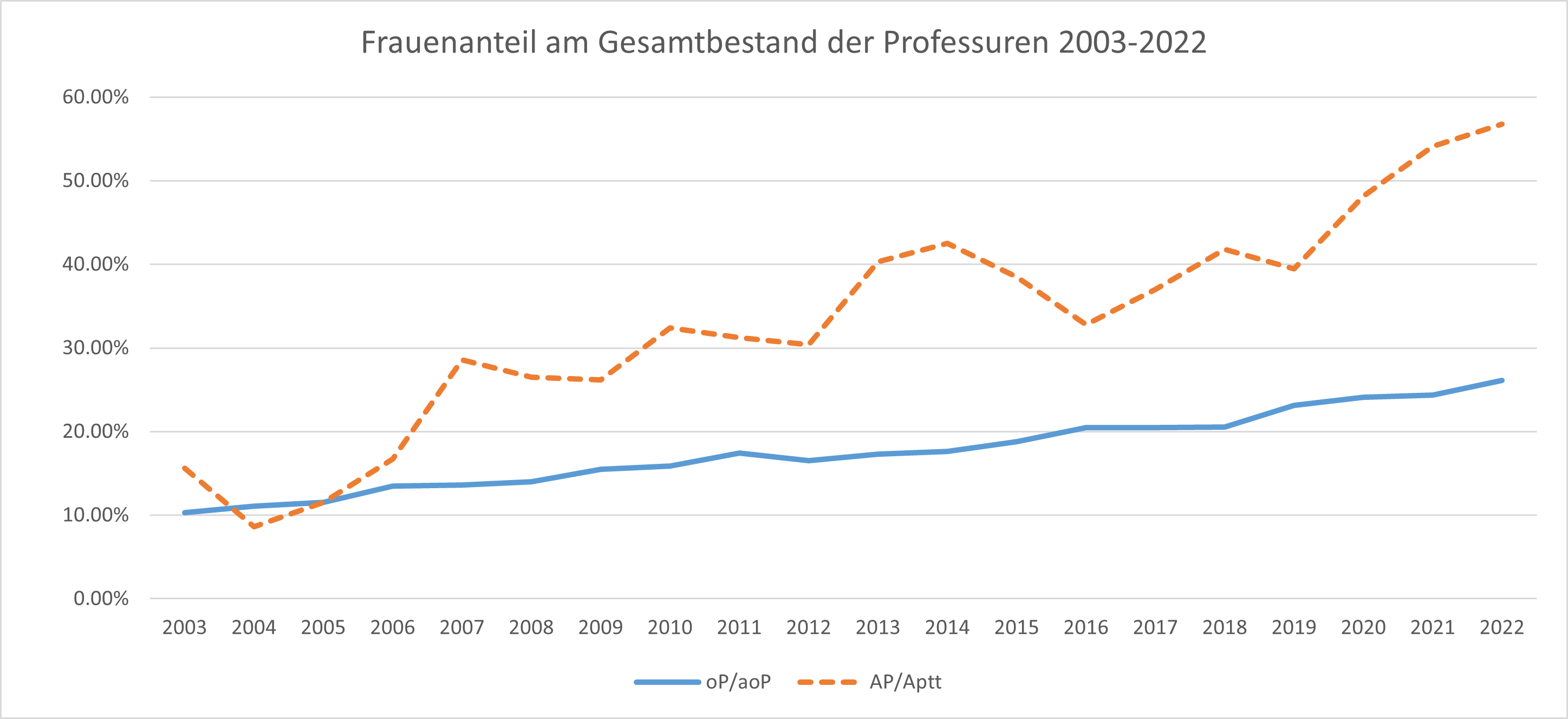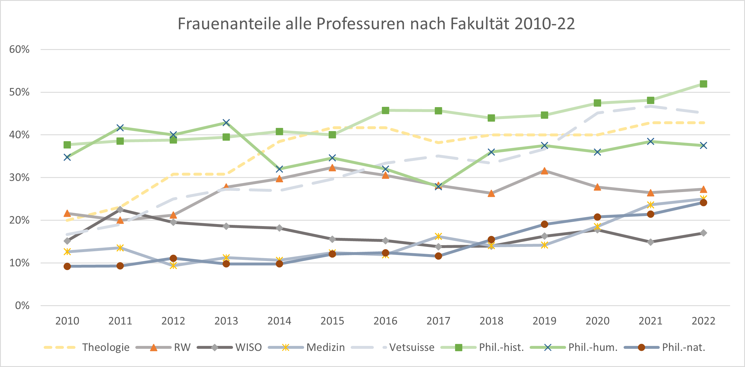 Besonders auf Stufe Professur sind die Frauenanteile nach wie vor sehr tief. Über die Zeit hat sich der Frauenanteil stetig, aber sehr langsam erhöht: