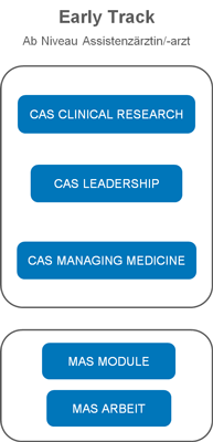 Der «Early Track» ist für Assistenzärzt:innen geeignet, die mit dem «CAS in Clinical Research in Health Care Organisations, Universität Bern» starten und in späteren Schritten die CAS Leadership und Managing Medicine absolvieren.